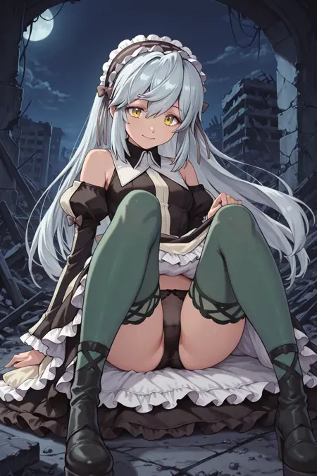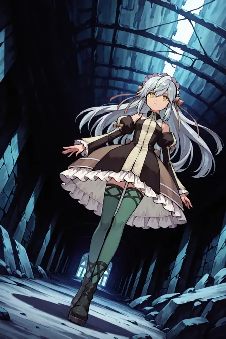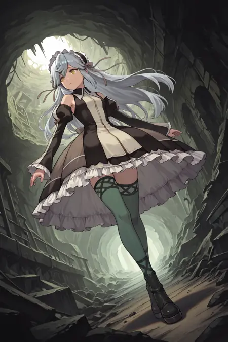 katrina, silver_hair, long_hair, frilled_dress, detached_sleeves, black_footwear, maid_headdress, green_thighhighs,