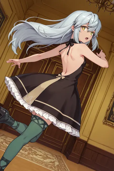 katrina, silver_hair, long_hair, backless_outfit, black_footwear, green_thighhighs,