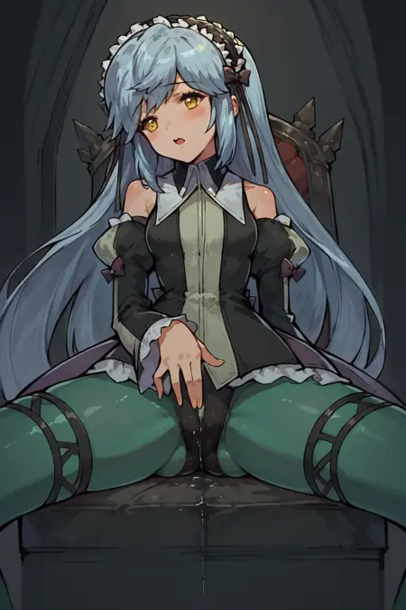 katrina, silver_hair, long_hair, frilled_dress, detached_sleeves, black_footwear, maid_headdress, green_thighhighs,