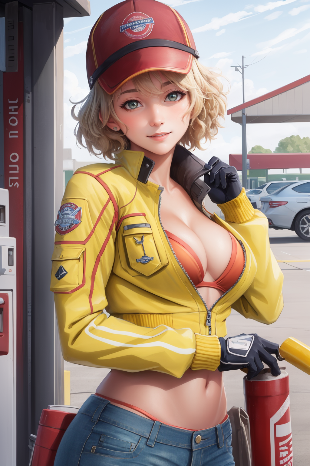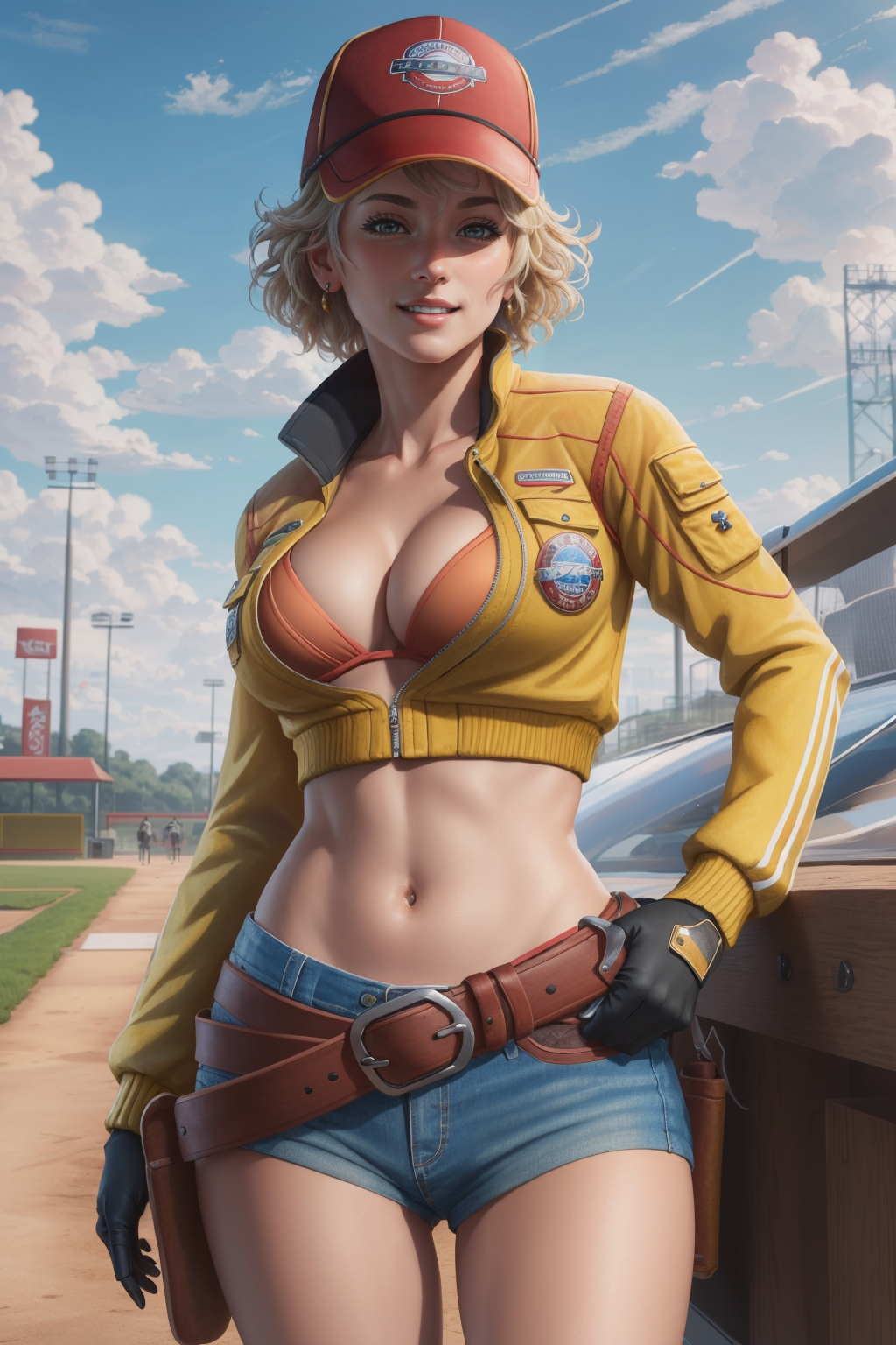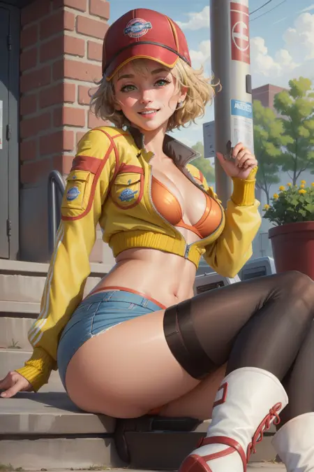 添加“棒球帽,短款夹克,事业线,橙色内衣,黑色手套,腰带,牛仔短裤,黑色长袜,白色靴子”以呈现她典型的外观。
