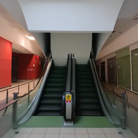 含められる要素: ガラス窓、閉まった店舗のシャッター、動作しないエスカレーター、サイン、ポスター