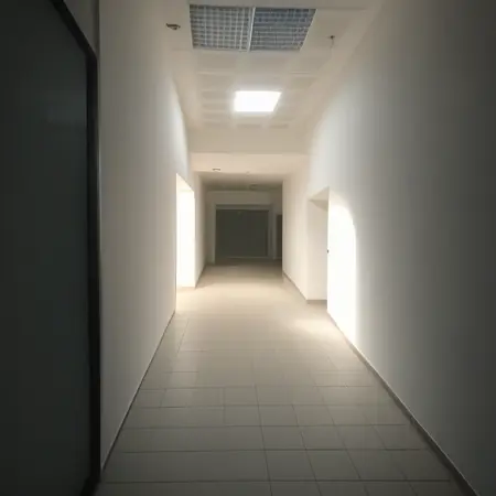 例: 横に複数のガラス窓があり、正面に店舗のシャッターが閉まっている空っぽの廊下