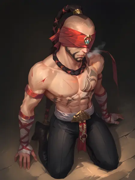 LeeSin, 1man, solo, shaved head, long black braid hairstyle, red blindfold with decoration, bristle, chest tattoo, abs, naked torso, white and red bandages on the arms, black pants with decoration, white and red bandages under pants, shoes