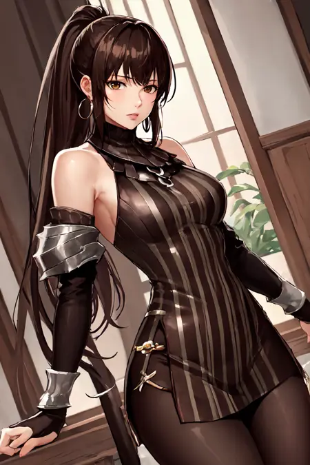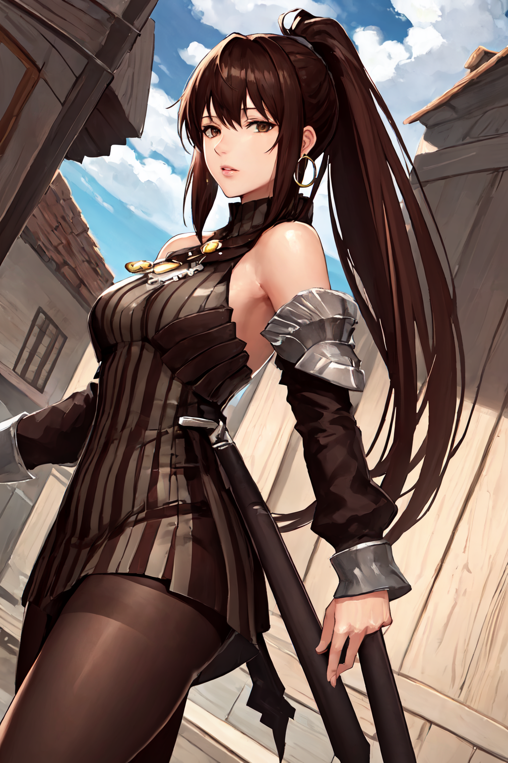 evy_(mabinogi), evy_outfits_1, 1girl, solo, long hair, brown hair, black hair, ponytail, lips, brown eyes, pantyhose, jewelry, earrings, hoop earrings, high heels, dress, armor, bare shoulders, detached sleeves,