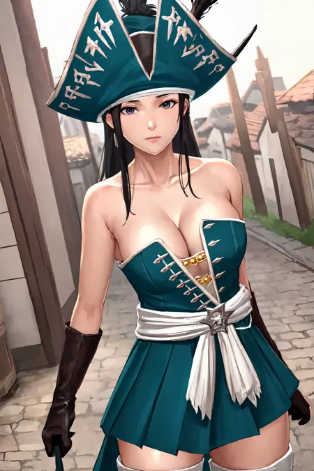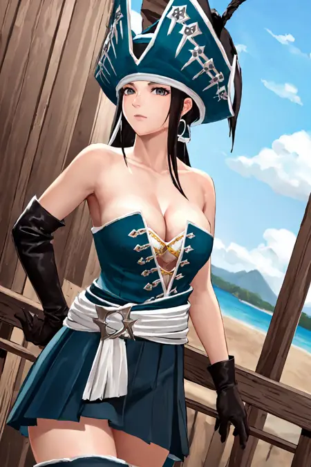 evy_(mabinogi), evy_outfits_2, 1girl, solo, boots, gloves, thighhighs, breasts, medium breasts, bare shoulders, cleavage, pirate hat, hat, black hair, strapless, strapless dress,