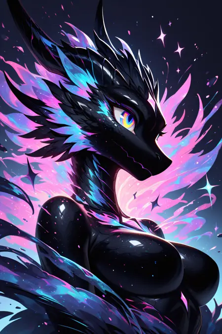 StarSilhouette, anthro, solo, (black body, black skin, colored skin, glowing, glistening body, glistening skin), (shadow creature:1.25), detailed glistening eyes, glowing multicolored eyes, multicolored freckles, crystal, sparkles, star, multicolored fire, (star (sky), space, galaxy)
