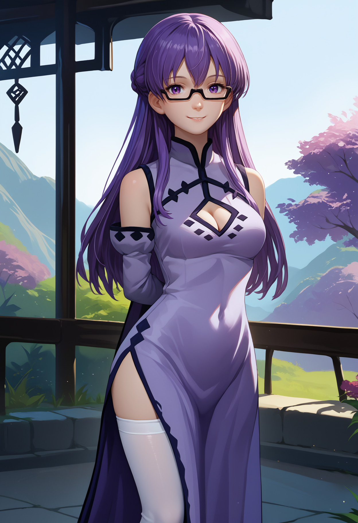 デフォルトの服: メガネ、パープルのドレス、チャイナドレス、胸元のカットアウト、サイドスリット、取り外し可能な袖、白い太ももハイズ、肩出し
