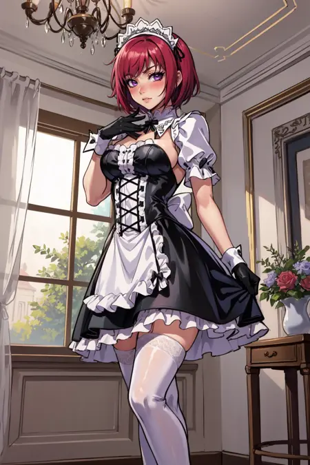 메이드 복장에는 "메이드 헤드피스, 메이드 복장, 흰색 허벅지 부분까지 오는 양말, 검정 장갑, 높은 구두" 추가.