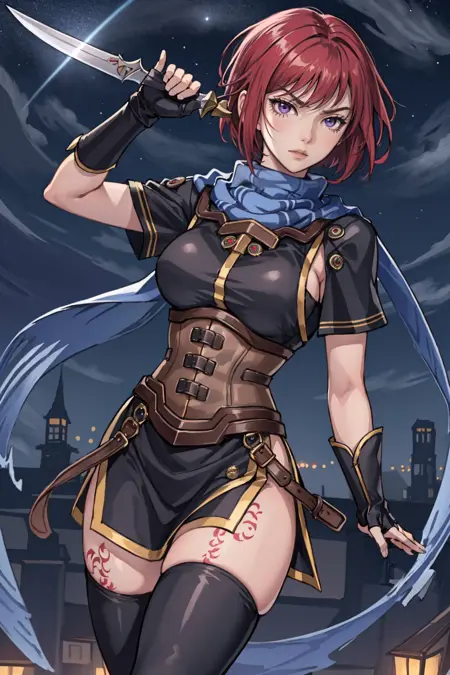 일반적인 모습에는 "줄무늬 목도리, 검정 드레스, 코르셋, 손가락 없는 장갑, 허벅지까지 오는 부츠" 추가.
