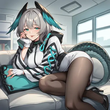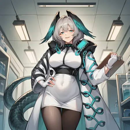Hoolheyak, short hair, grey hair, head wings, snake tail, aqua eyes,