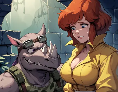 爱普莉尔: april o'neil,黄色连体服,大乳房,乳沟,黑色眼睛,嘴唇,妆容,口红