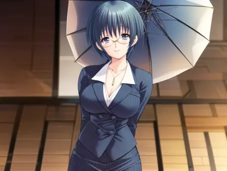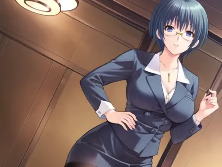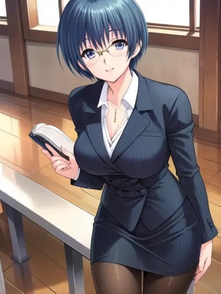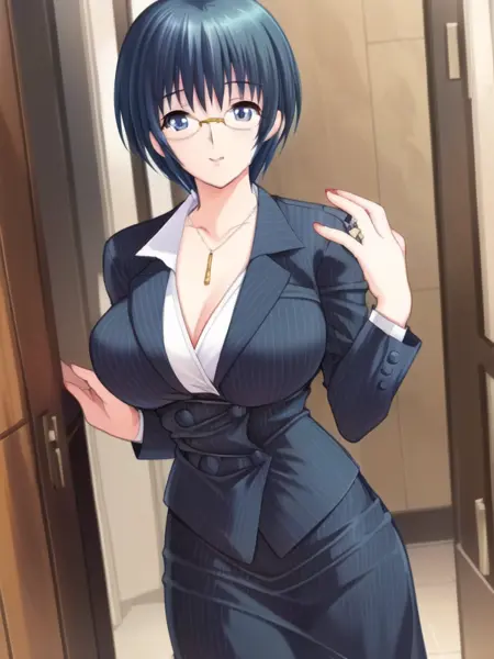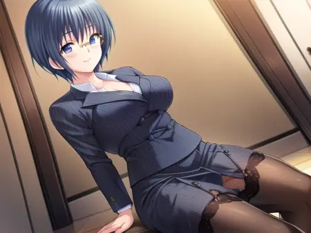 Izawa_Ritsuko,short hair,blue hair,blue_eyes,suit,pencil_skirt,pantyhose,