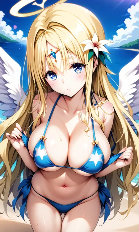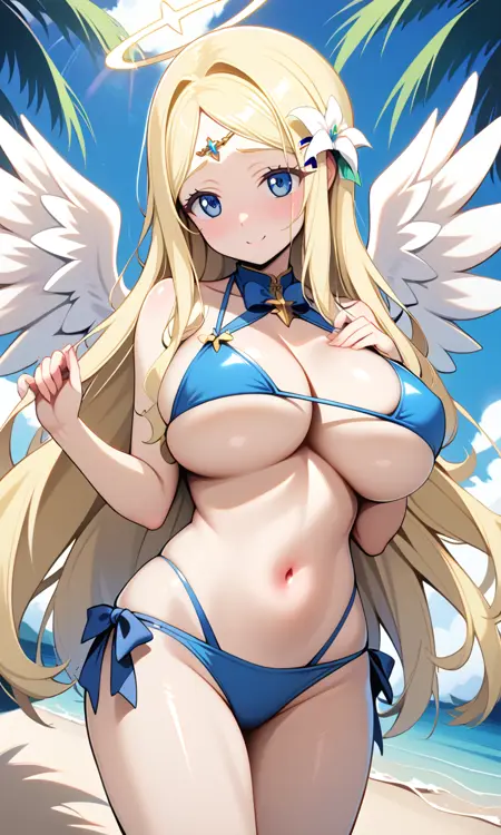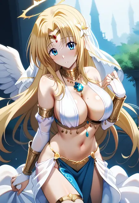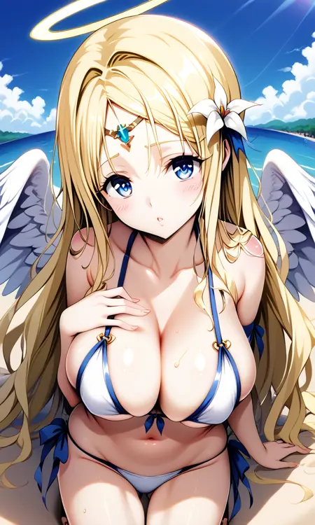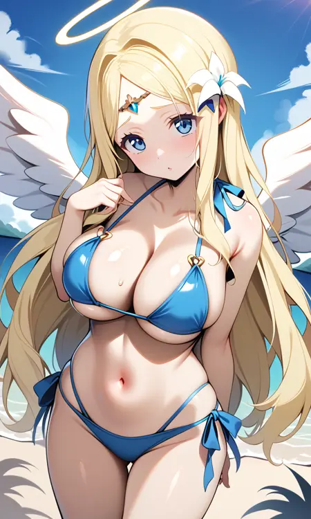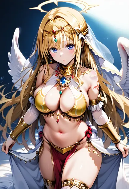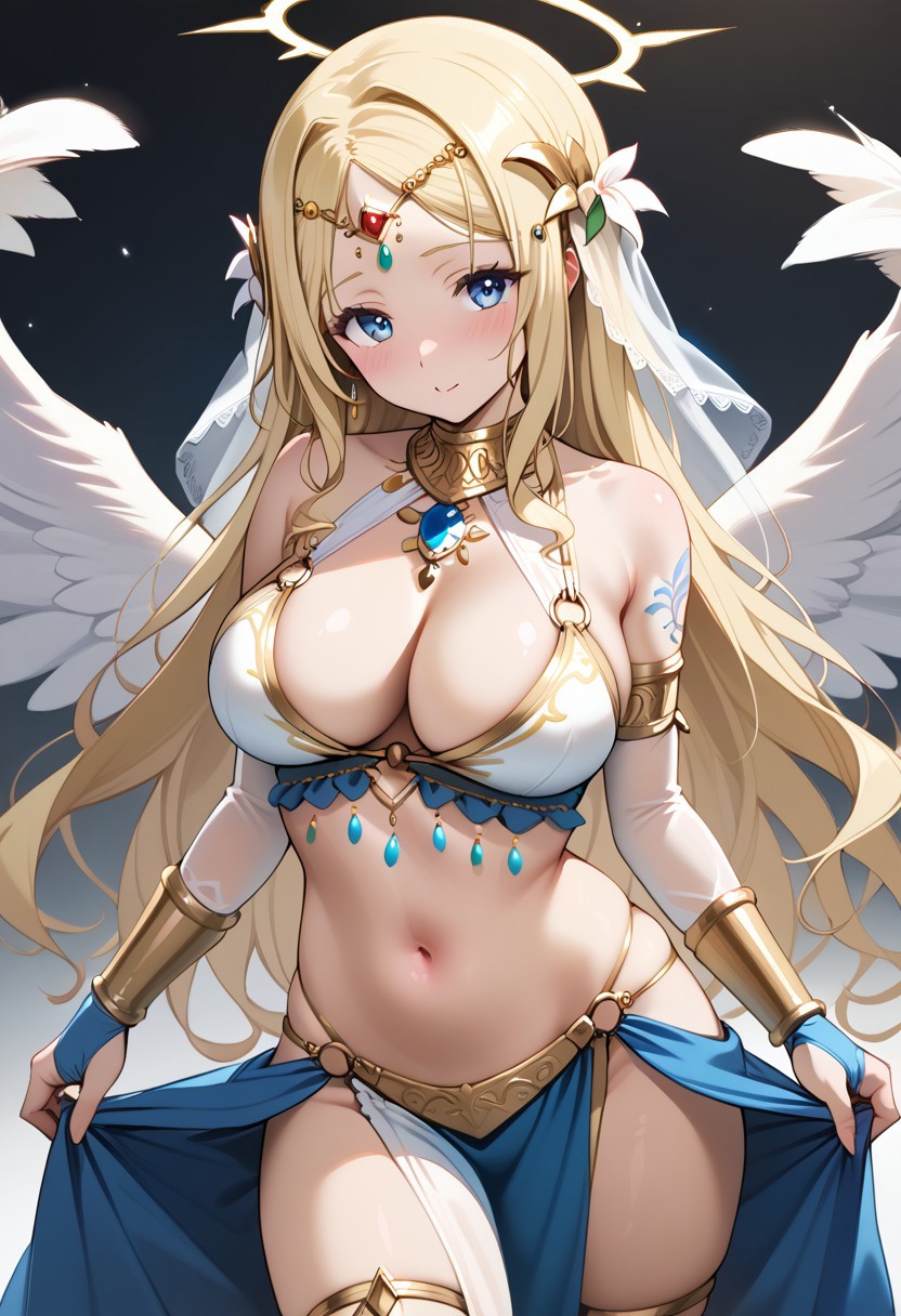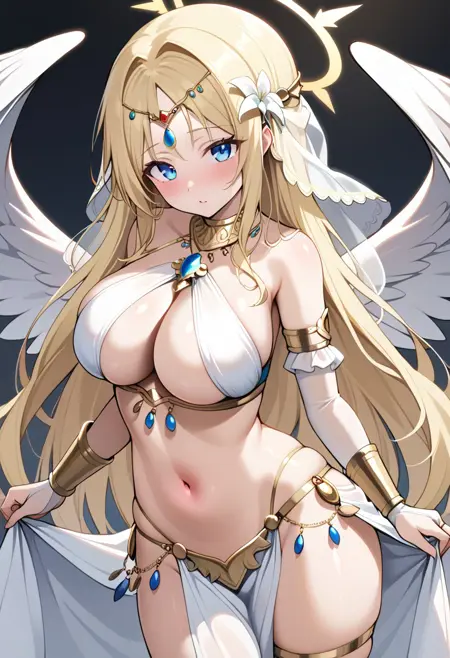 Gabriel, wavy blonde hair, blue eyes, milky white skin, white angel wings, big breast, wide hips, halo,