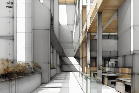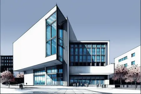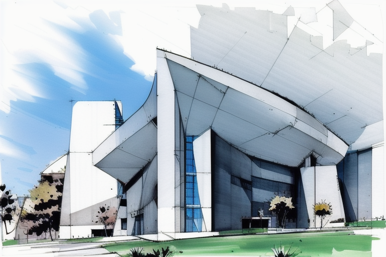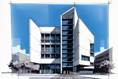 这是一个现代建筑手绘风格的模型,以简洁的钢笔线条和马克笔、彩铅色彩。