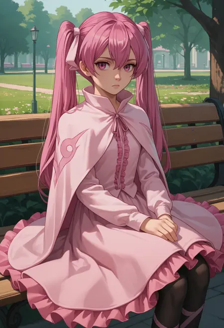 默认服装: 粉色小披肩,粉色衬衫,长袖,粉色裙子,荷叶边裙子,黑色连裤袜