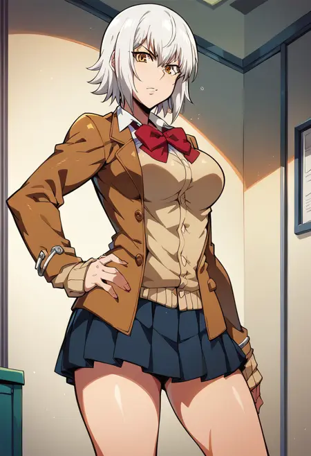 학교 복장: 파란 치마, 셔츠, 빨간 리본 넥타이, 갈색 재킷
