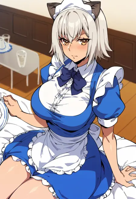 Maid Costume: blue maid costume, maid headdress, blue ribbon, apron, animal ears