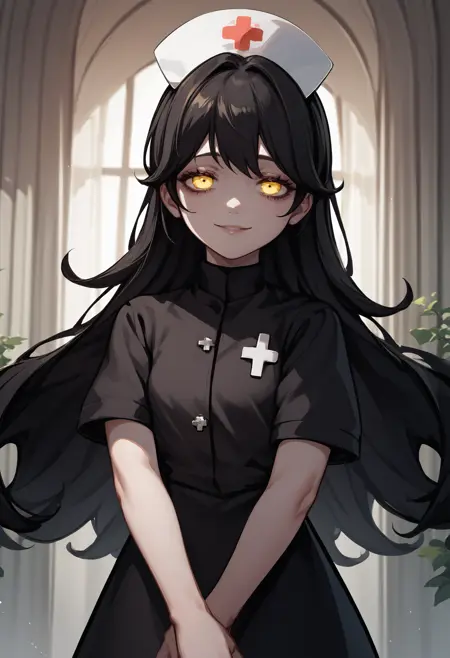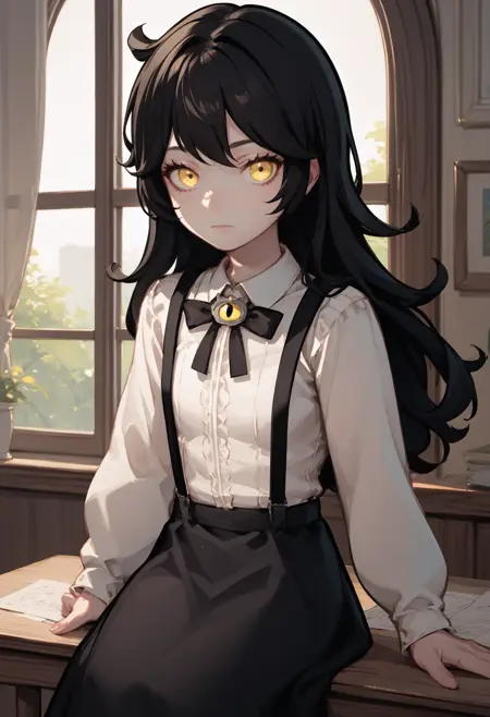 grimmi, black hair, yellow eyes, long hair, black neck ribbon, white shirt, suspenders, black skirt