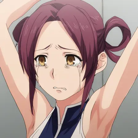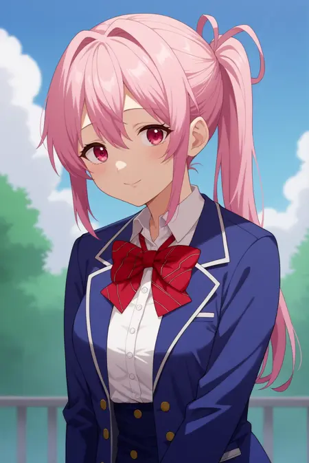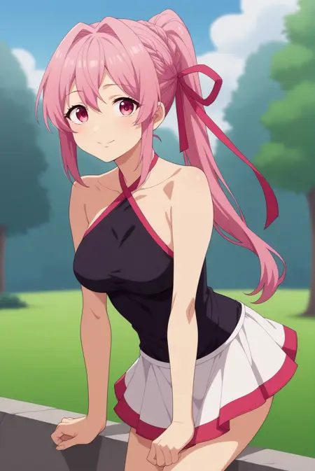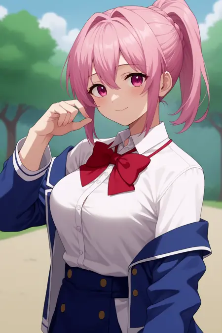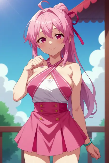 トリガー:濃いピンクの虹彩、ピンクの髪、丸い目、レイド、長い髪、編み上げのポニーテール、濃いハルター