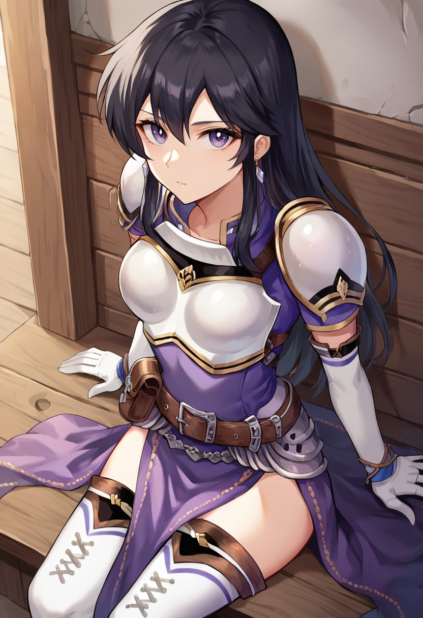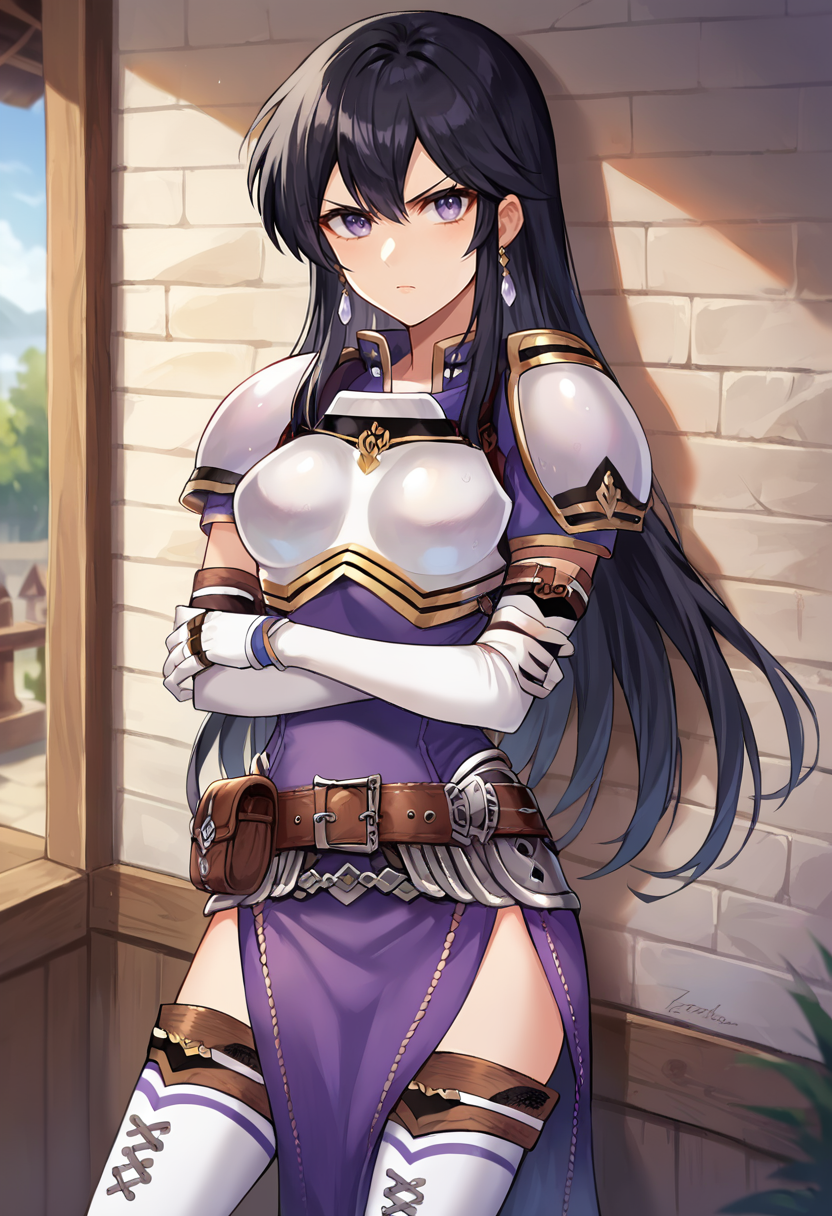 score_9, score_8_up, score_7_up, masterpiece, source_anime 1girl, ct_ayra, light purple eyes, black hair, long hair, earrings, purple dress, short sleeves, pauldrons, breastplate, armor, elbow gloves, brown belt, belt pouch, pelvic curtain, thigh boots, thighs, indoors, wooden wall, looking at viewer, cowboy shot, hand up,