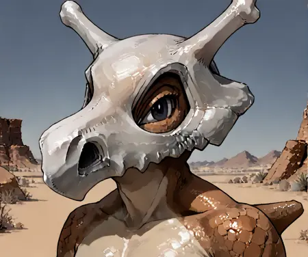 cubone, pokemon, 骷髅头, 骷髅, 黑色/绿色/琥珀色/蓝色 眼睛, 白色巩膜, 多色 鳞片/皮肤, 棕色 鳞片/皮肤, 米色躯干, 粉红色/棕色 乳头,