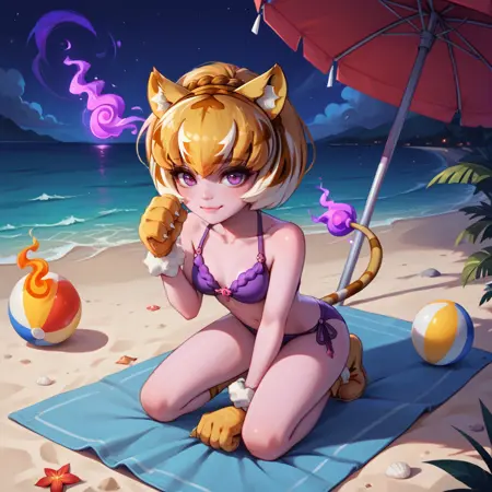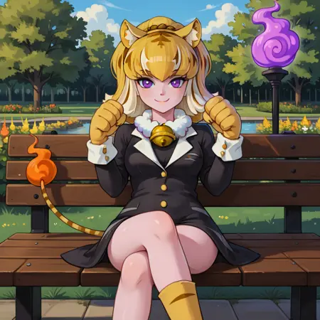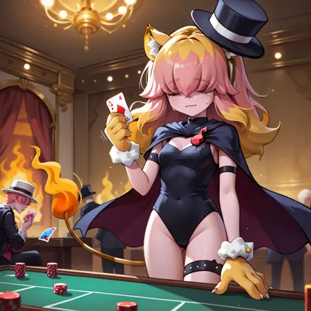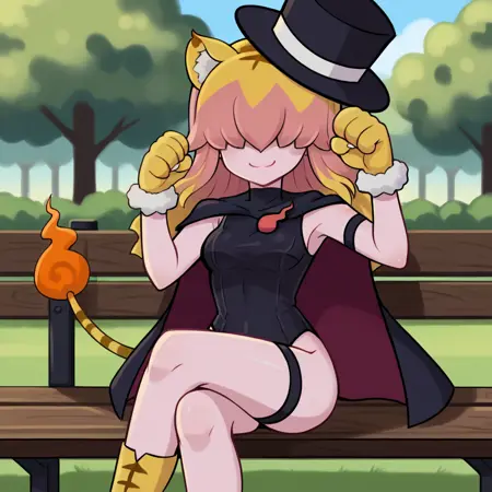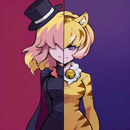| 训练词汇 | kirene,tiger girl,pink skin,animal ears,two-tone hair,pink hair,blonde hair,covered eyes,hair over eyes,mini top hat,black cape,two-sided cape,black leotard,fire pin,tiger tail,flame-tipped tail,thigh strap,armlet,paw shoes,paw gloves,animal print已复制! catleen, tiger girl, pink skin, tiger hair, animal ears, purple eyes, paw gloves, paw shoes, tiger tail, flame-tipped tail, purple fire, neck bell, fur collar, suit dress, tiger print已复制! |
