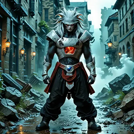 태그: sealasdb, score_9, source_anime, 색상이 있는 피부, 회색과 흰색 피부, 빨간 눈,觸手 같은 머리카락, 바지, 갑옷