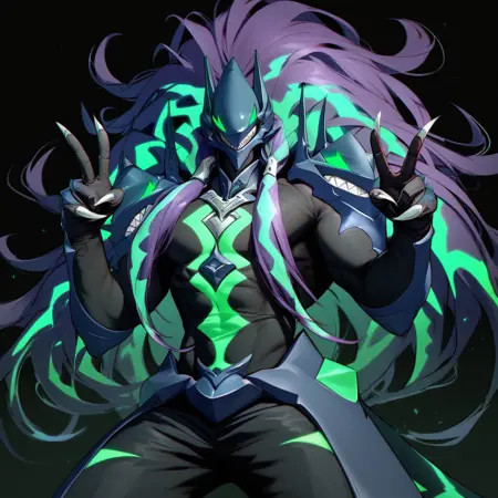 正面提示:Susano'o,人形,绿色眼睛,无瞳孔,紫色头发,绿色头发,双色头发,长发,爪子,尖牙,尾巴,黑色身体,绿色身体,双色身体,黑色裤子,微笑