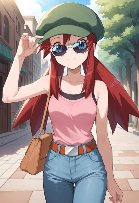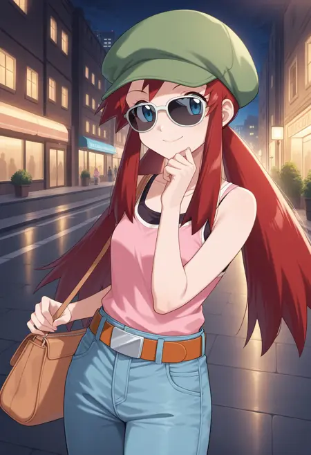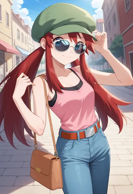 score_9, score_8_up, score_7_up, masterpiece, source_anime 1girl, ct_melody, blue eyes, red hair, twintails, green headwear, sunglasses, pink tank top, jeans, belt, brown handbag, indoors, wooden wall, looking at viewer, cowboy shot,