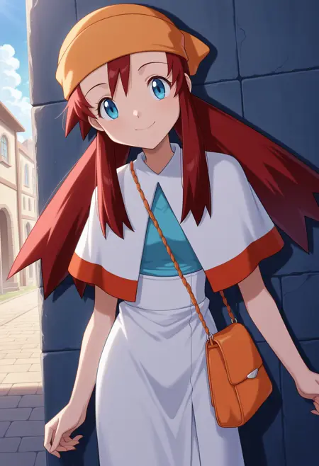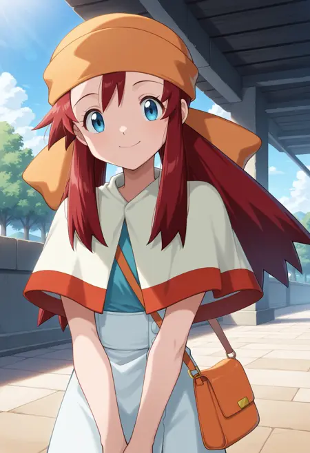 衣装 1: オレンジのバンダナ、シアンのキャミソール、カプセル型のカーディガン、白いハイウエストスカート、オレンジのハンドバッグ,