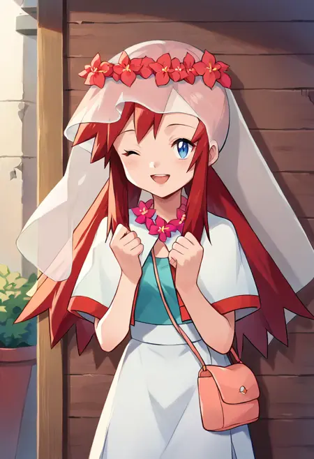 衣装 3: 花の花冠、ヴェール、花のネックレス、シアンのタンクトップ、カプセル型のカーディガン、白いハイウエストスカート、オレンジのハンドバッグ,