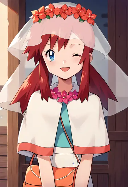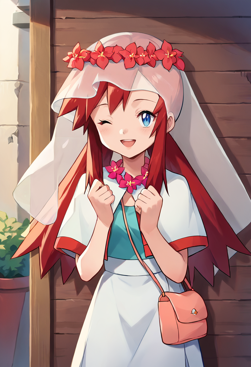 Clothing 3: flower wreath, veil, flower necklace, cyan tank top, capelet, white high-waist skirt, orange handbag,
