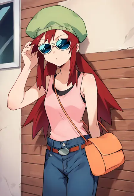 score_9, score_8_up, score_7_up, masterpiece, source_anime 1girl, ct_melody, blue eyes, red hair, twintails, green headwear, sunglasses, pink tank top, jeans, belt, brown handbag, indoors, wooden wall, looking at viewer, cowboy shot,