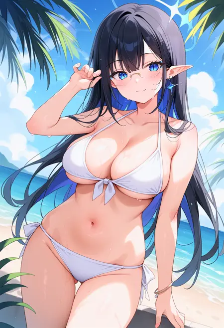 r_nanakami, 1girl, halo, black hair, long hair, blue eyes, slit pupils, colored inner hair, blue hair, multicolored hair, two-tone hair, solo, pointy ears, bangs, large breasts