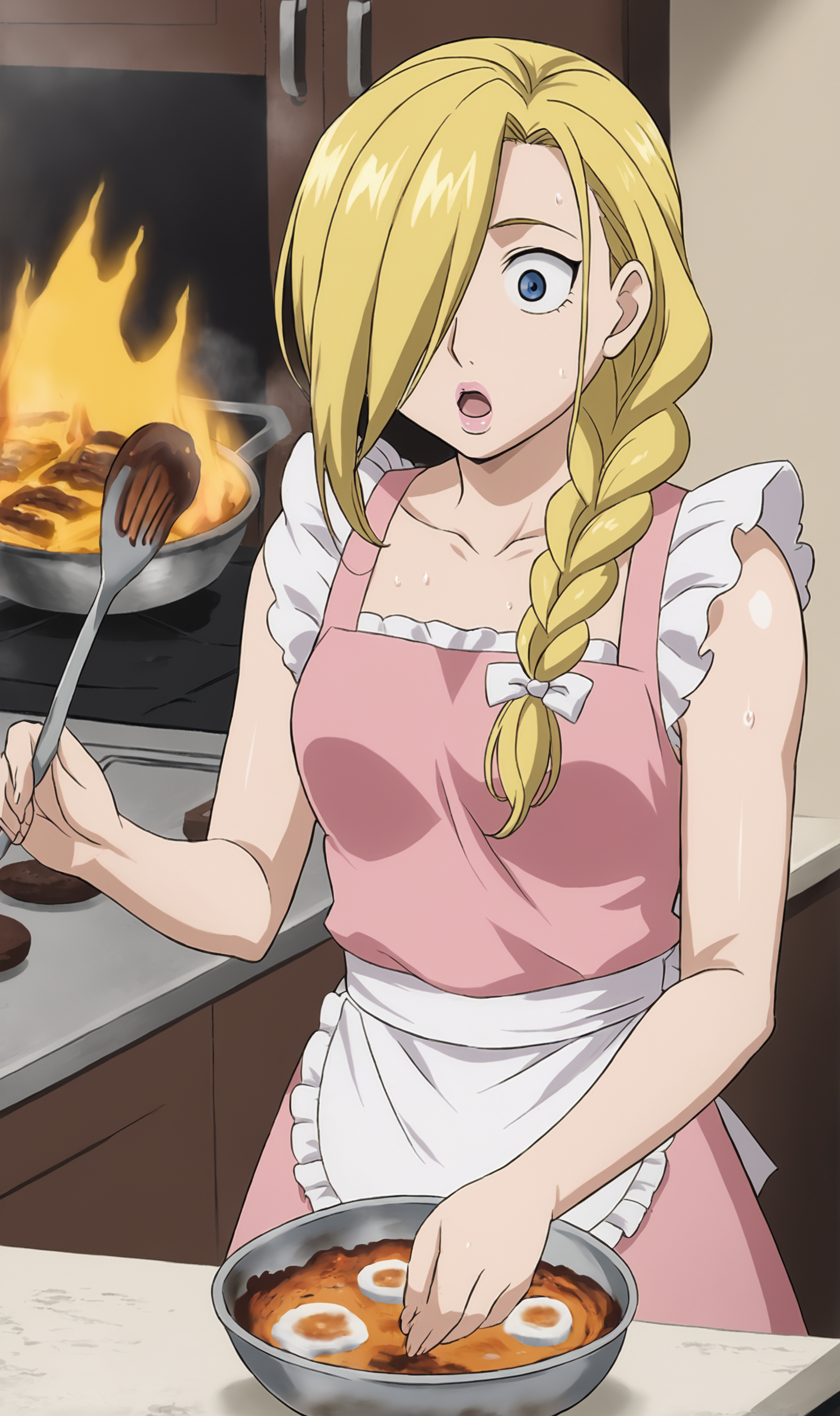 주요 얼굴 특징 - '금발 머리, 긴 머리, 한쪽 눈 위의 머리카락, 파란 눈'