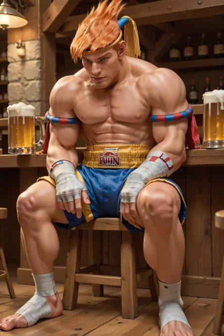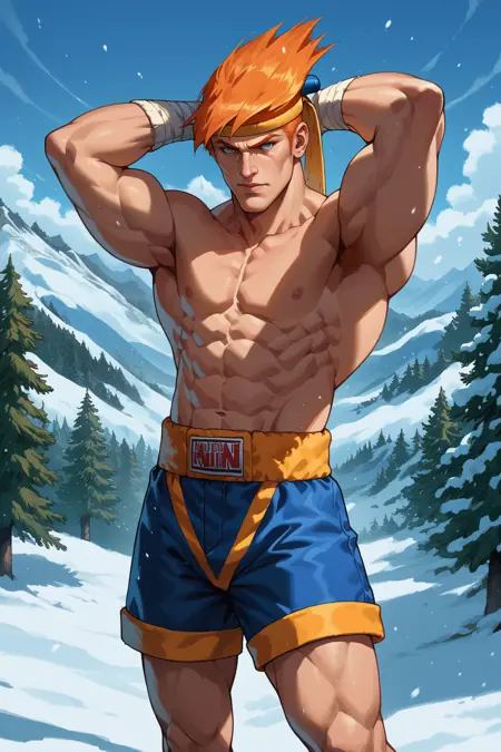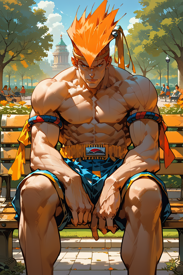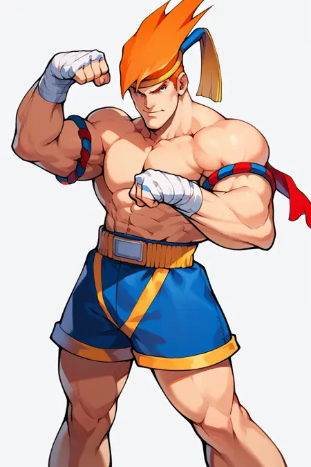 その他ヒントになる言葉:オレンジ色の髪、ヘッドバンド、筋肉質、包帯、アームバンド、上半身裸、ショートパンツ