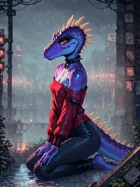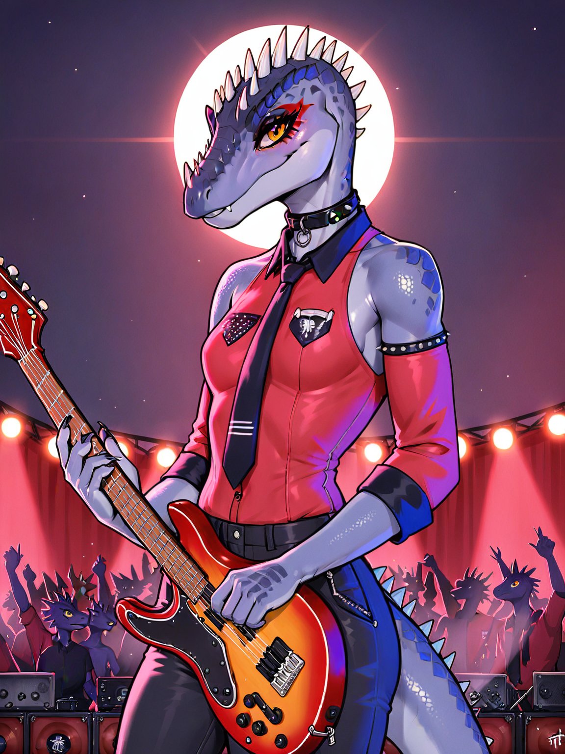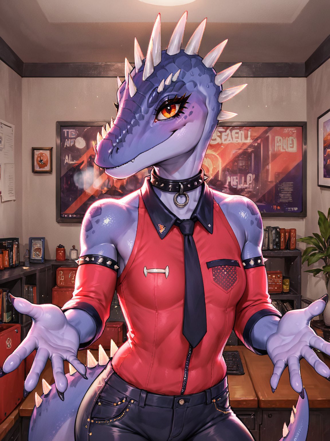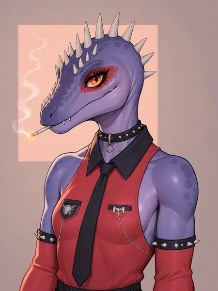 프롬프트: Tryx, 공룡, 보라색 피부, 주황색 눈, 속눈썹, 검은 바지, 빨간 셔츠, 빨간 소매, 셔츠의 검은 칼라, 드러난 어깨, 검은 넥타이, 머리에 돌기, 비늘, 눈 주변의 검은 동그라미, 검은 칼라.