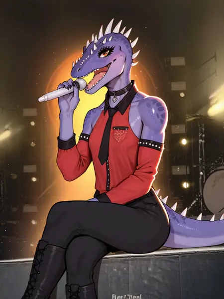 プロンプト: Tryx, 恐竜, 紫の肌, オレンジ色の目, 睫毛, 黒いズボン, 赤いシャツ, 赤い袖, シャツの黒いカラー, 肩を露出, 黒いネクタイ, 頭のとげ, 鱗, 目の周りの黒い輪, 黒いカラー。