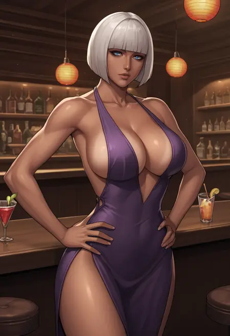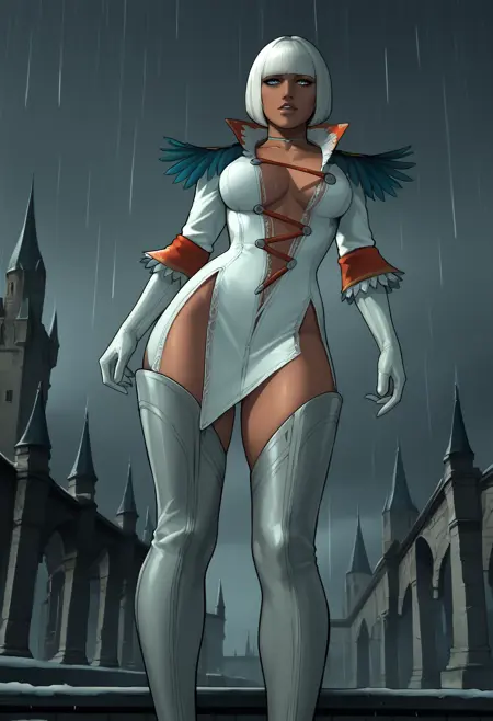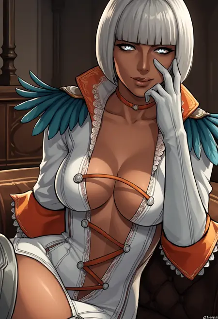 gloria_dmc, white hair, blue eyes, short hair, bob cut, blunt bangs, tan, thigh boots, white dress, center opening, plungin neckline, feathers, choker, white gloves, lips, innerboob, cross-laced clothes,