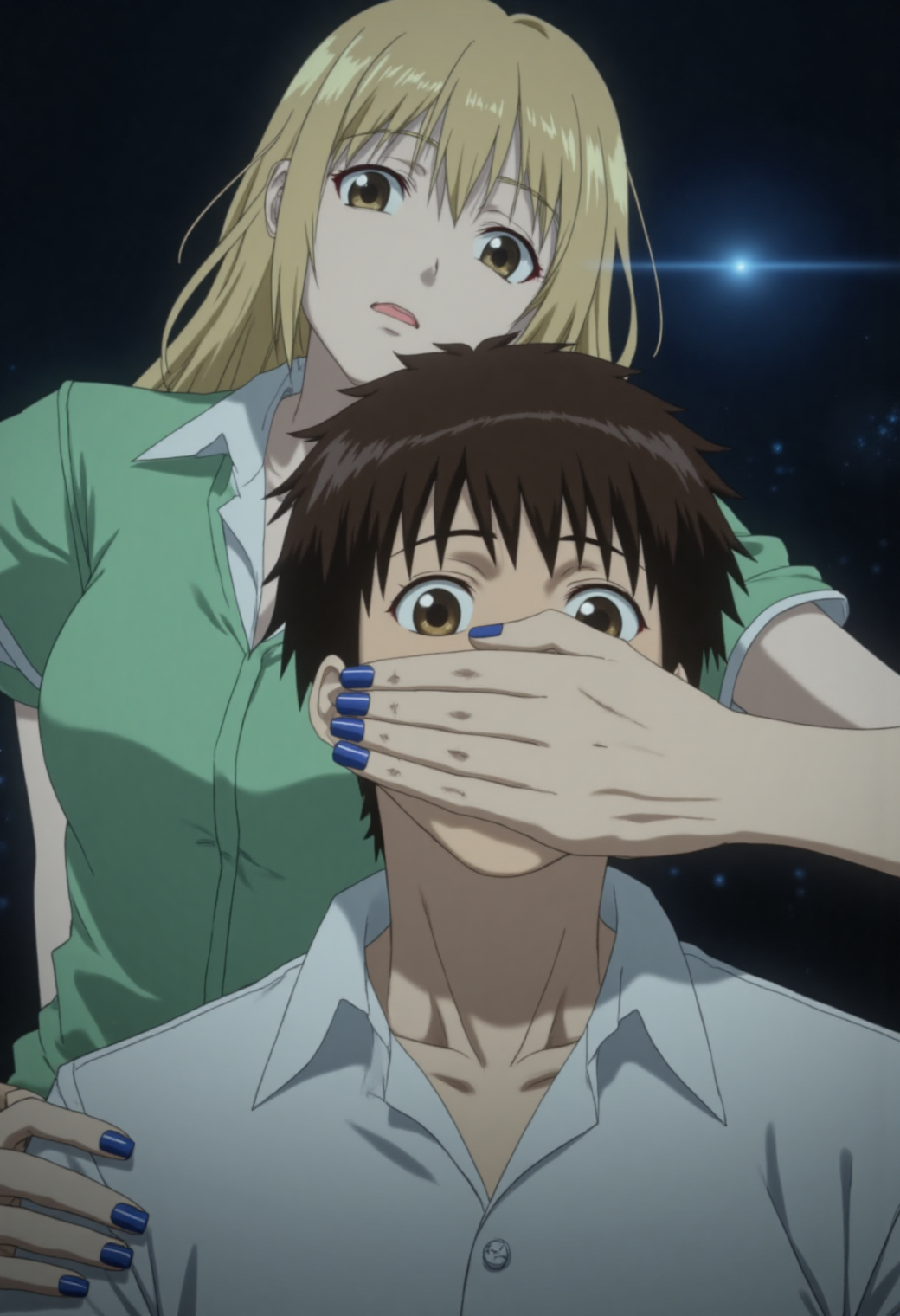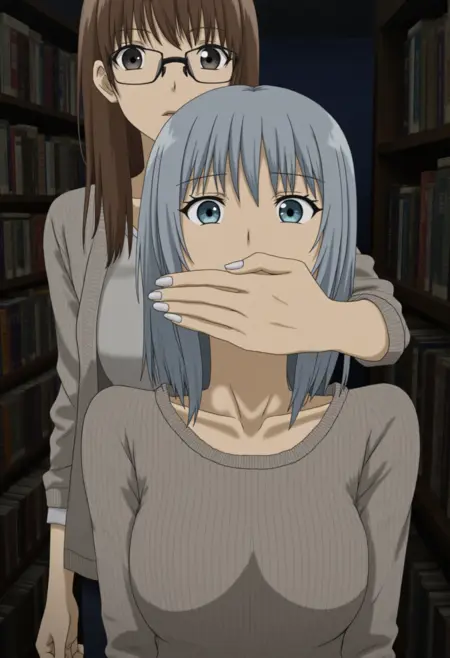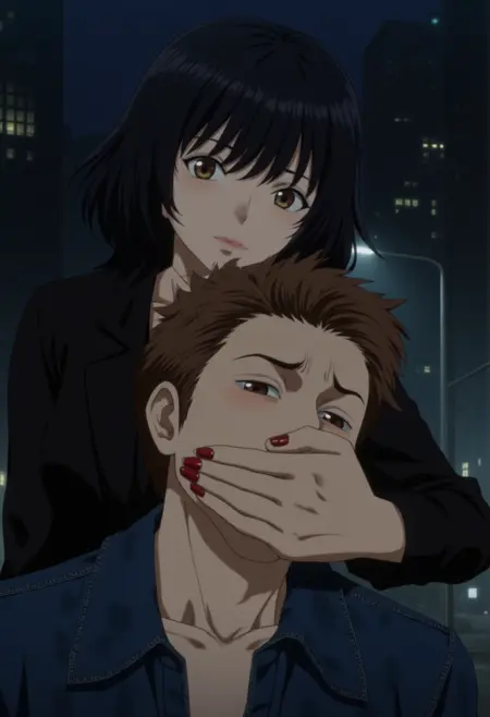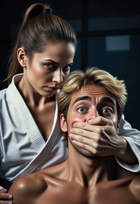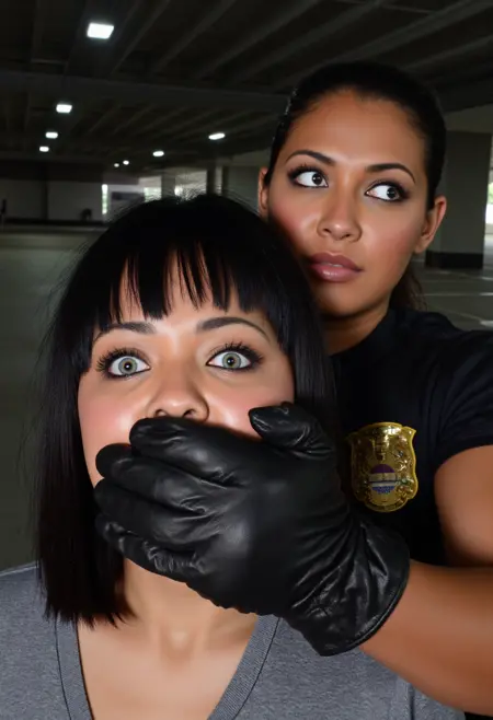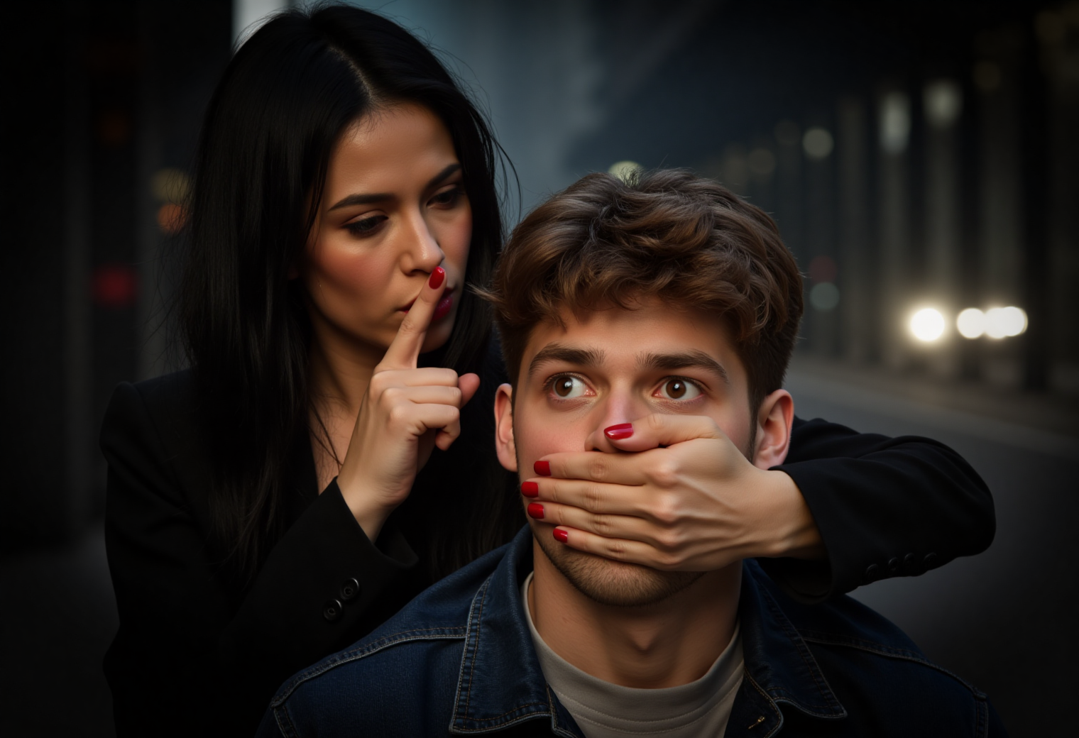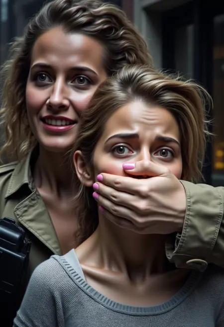 [An amateur/A professional] [close-up/wide-shot] [photograph] featuring a [victim's gender] and a [assaulter's gender] behind [him/her]. A [description of the assailant] covers the [victim's gender]'s mouth with [his/her] hand. [His/Her][description of the hand] hand [other description if needed] [tightly/gently] covers the mouth of a [brief victim description] [victim's gender]. [Describe here what the assaulter is doing with his free arm]. The victim has [victim's detailed description]. [Describe here where the assailant and victim are looking]. [Environment and setting description].