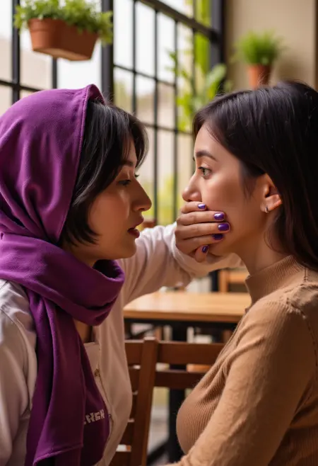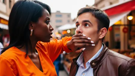 [业余/专业] [特写/广角] [照片],画面中有一位 [受害者性别] 和一位 [施害者性别] 站在 [他/她] 身后。一位 [施害者描述] 用 [他/她] 的手捂住了 [受害者性别] 的嘴。_ [他/她]_ 的 [手部描述] 手 [如有需要可补充其他描述] [紧紧/轻柔地] 捂住一位 [简短受害者描述] 的 [受害者性别] 的嘴。_ [描述施害者空闲手臂正在做什么]。受害者具有 [受害者详细描述]。 [描述施害者与受害者目光所向]。 [环境与场景描述]_。