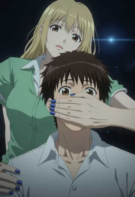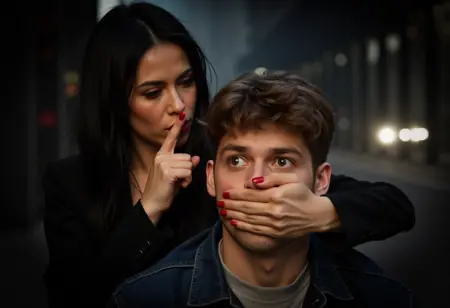 [애매한/전문적인] [클로즈업/원근 촬영] _[사진]_은 _[피해자의 성별]_과 그 뒤에 있는 _[가해자의 성별]_을 보여줍니다. _[가해자의 묘사]_가 _[피해자의 성별]_의 입을 [그의/그녀의] 손으로 가립니다. [그의/그녀의][손의 묘사] 손은 _[필요시 추가 설명]_을 통해 [간단한 피해자 묘사] _[피해자의 성별]_의 입을 [단단히/부드럽게] 가립니다. [가해자가 자유로운 팔로 하는 행동을 여기에 설명하세요]. 피해자는 _[피해자의 상세한 묘사]_를 가지고 있습니다. [가해자와 피해자가 어디를 바라보고 있는지 여기에 설명하세요]. [환경 및 배경 설명].