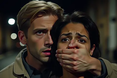 [业余/专业] [特写/广角] [照片],画面中有一位 [受害者性别] 和一位 [施害者性别] 站在 [他/她] 身后。一位 [施害者描述] 用 [他/她] 的手捂住了 [受害者性别] 的嘴。_ [他/她]_ 的 [手部描述] 手 [如有需要可补充其他描述] [紧紧/轻柔地] 捂住一位 [简短受害者描述] 的 [受害者性别] 的嘴。_ [描述施害者空闲手臂正在做什么]。受害者具有 [受害者详细描述]。 [描述施害者与受害者目光所向]。 [环境与场景描述]_。