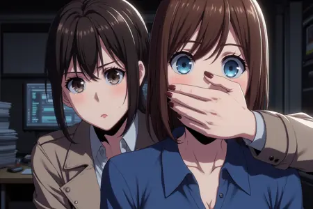 [业余/专业] [特写/广角] [照片],画面中有一位 [受害者性别] 和一位 [施害者性别] 站在 [他/她] 身后。一位 [施害者描述] 用 [他/她] 的手捂住了 [受害者性别] 的嘴。_ [他/她]_ 的 [手部描述] 手 [如有需要可补充其他描述] [紧紧/轻柔地] 捂住一位 [简短受害者描述] 的 [受害者性别] 的嘴。_ [描述施害者空闲手臂正在做什么]。受害者具有 [受害者详细描述]。 [描述施害者与受害者目光所向]。 [环境与场景描述]_。