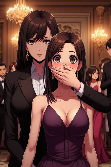 [An amateur/A professional] [close-up/wide-shot] [photograph] featuring a [victim's gender] and a [assaulter's gender] behind [him/her]. A [description of the assailant] covers the [victim's gender]'s mouth with [his/her] hand. [His/Her][description of the hand] hand [other description if needed] [tightly/gently] covers the mouth of a [brief victim description] [victim's gender]. [Describe here what the assaulter is doing with his free arm]. The victim has [victim's detailed description]. [Describe here where the assailant and victim are looking]. [Environment and setting description].