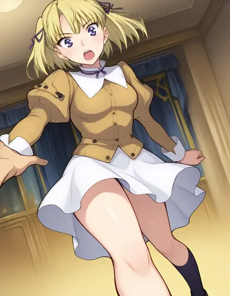 two side up, long sleeves, brown short dress, puffy sleeves, white skirt