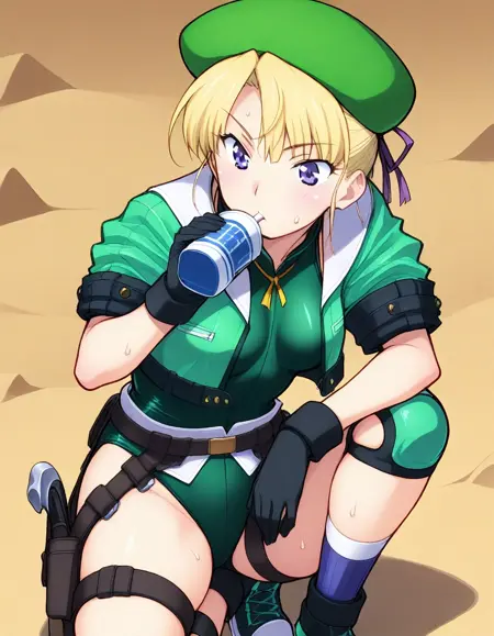 short hair, black gloves, hat, green jacket, short sleeves, green leotard, beret, green knee pads, cropped jacket, holster