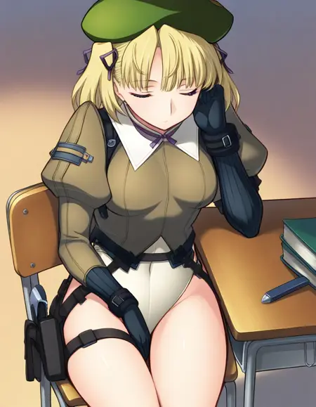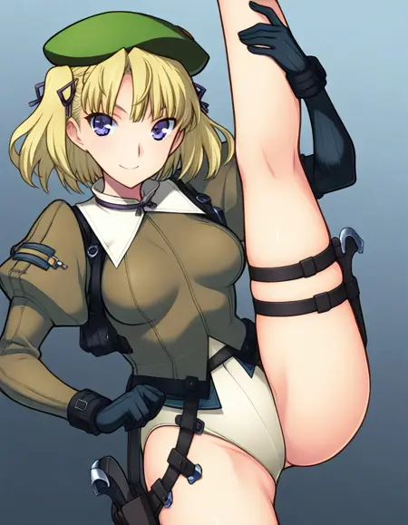 urza_mil1t4ry, two side up, beige military outfit, gloves, hat, ribbon, hair ribbon, puffy sleeves, white leotard, beret, holster