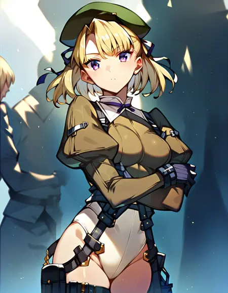 urza_mil1t4ry, two side up, beige military outfit, gloves, hat, ribbon, hair ribbon, puffy sleeves, white leotard, beret, holster