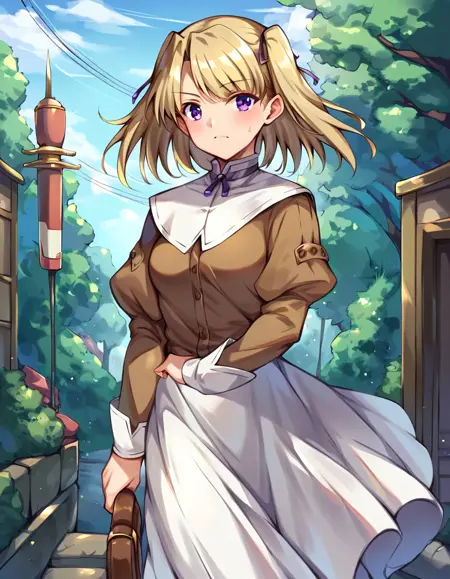 two side up, long sleeves, brown short dress, puffy sleeves, white skirt